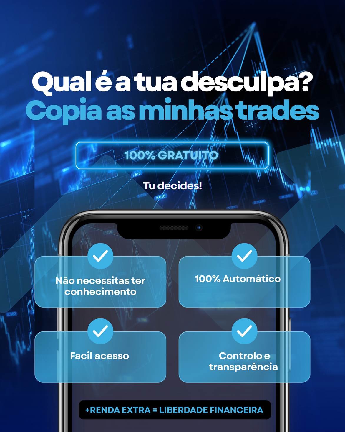 Com o copy trading, você replica automaticamente as operações de traders profissionais. É uma forma inteligente de gerar renda extra, e colocar seu dinheiro para trabalhar.